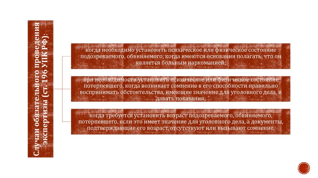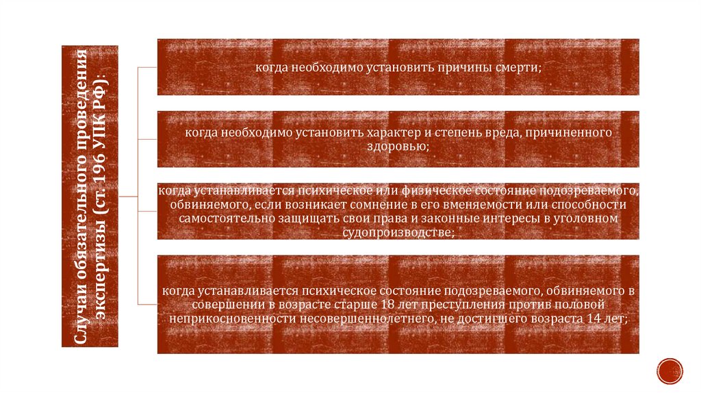 Случаи обязательного проведенияэкспертизы (ст. 196 УПК РФ):