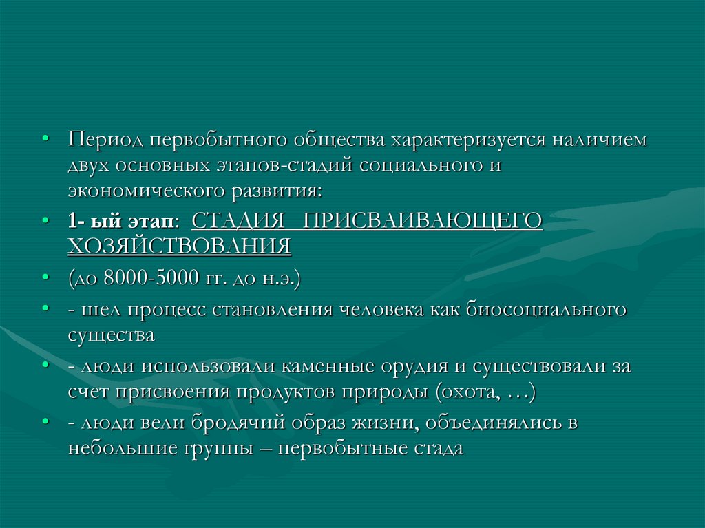 • Период первобытного общества характеризуется наличиемдвух основных этапов-стадий социального и