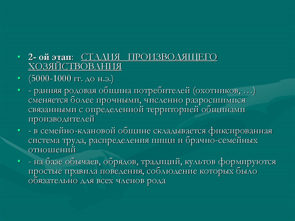 • 2- ой этап: СТАДИЯ ПРОИЗВОДЯЩЕГОХОЗЯЙСТВОВАНИЯ