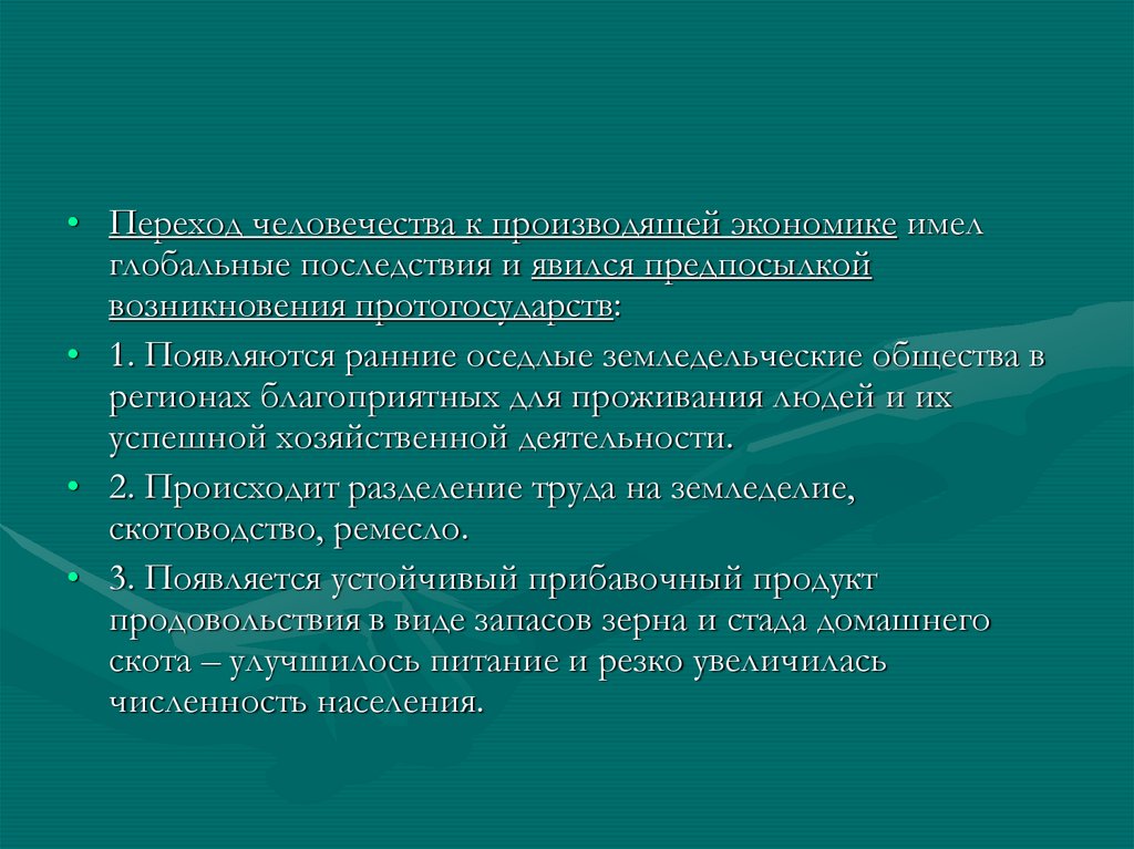 • Переход человечества к производящей экономике имелглобальные последствия и явился предпосылкой