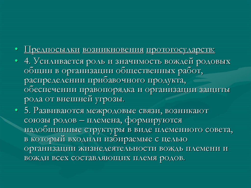 • Предпосылки возникновения протогосударств:• 4. Усиливается роль и значимость вождей родовых