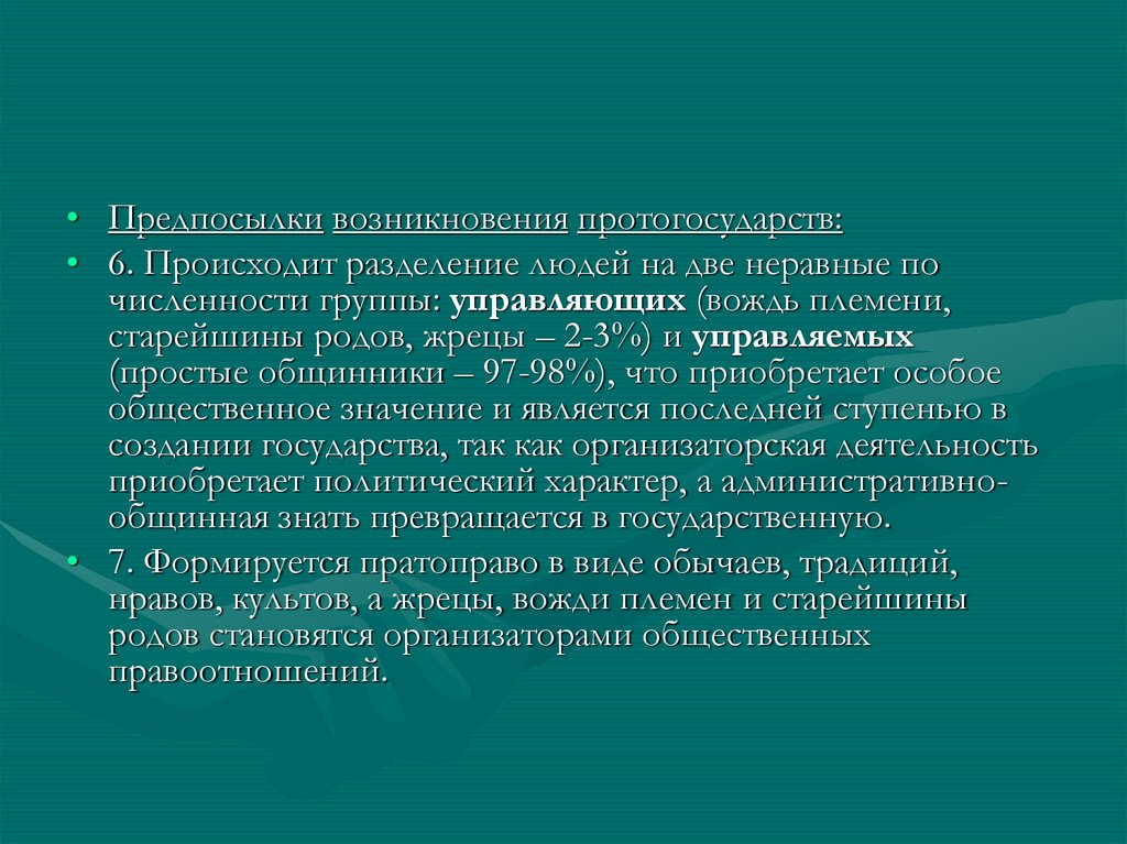 • Предпосылки возникновения протогосударств:• 6. Происходит разделение людей на две неравные по