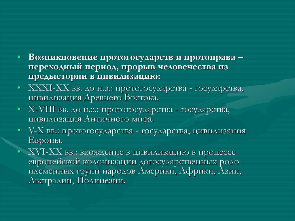• Возникновение протогосударств и протоправа –переходный период, прорыв человечества из