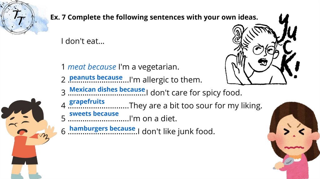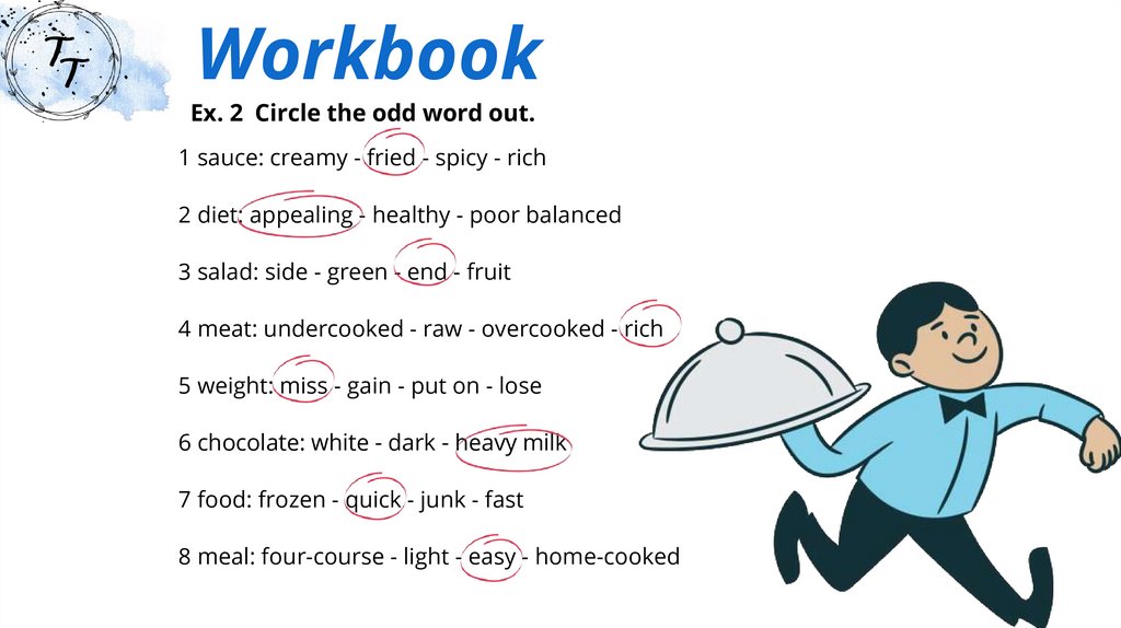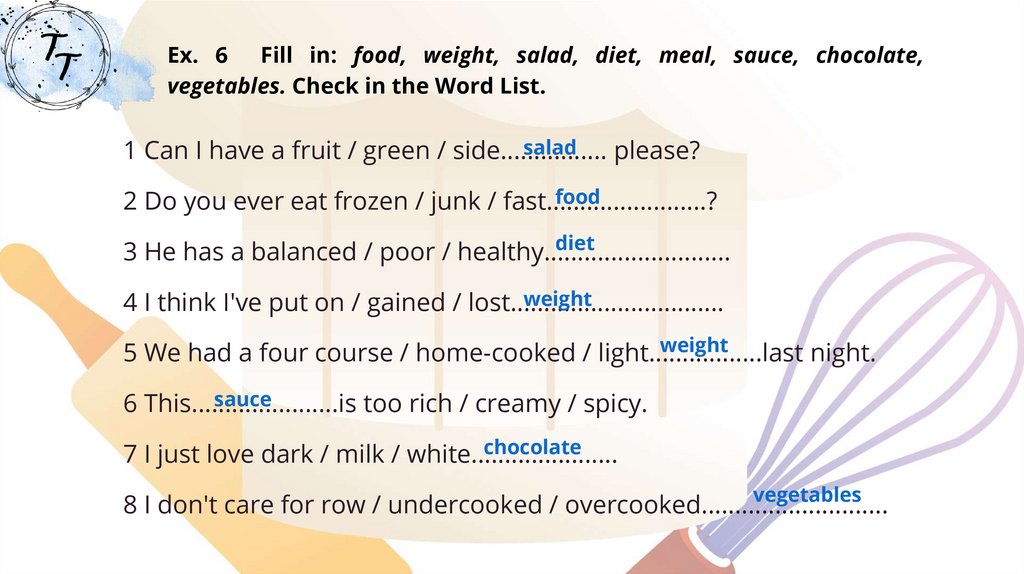 TTEx. 6 Fill in: food, weight, salad, diet, meal, sauce, chocolate,