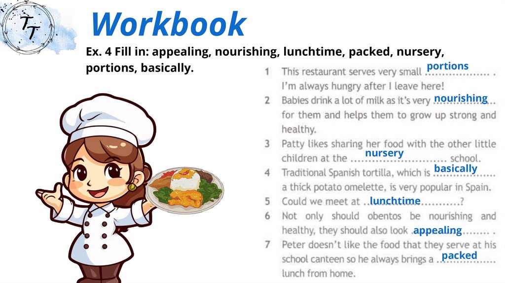 Ex. 4 Fill in: appealing, nourishing, lunchtime, packed, nursery,