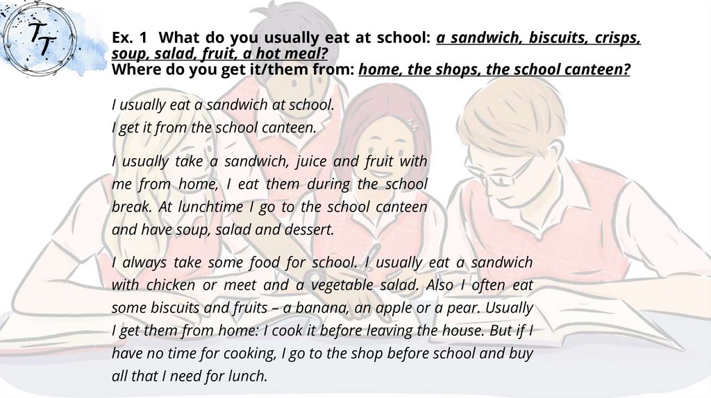 TTEx. 1 What do you usually eat at school: a sandwich, biscuits, crisps,