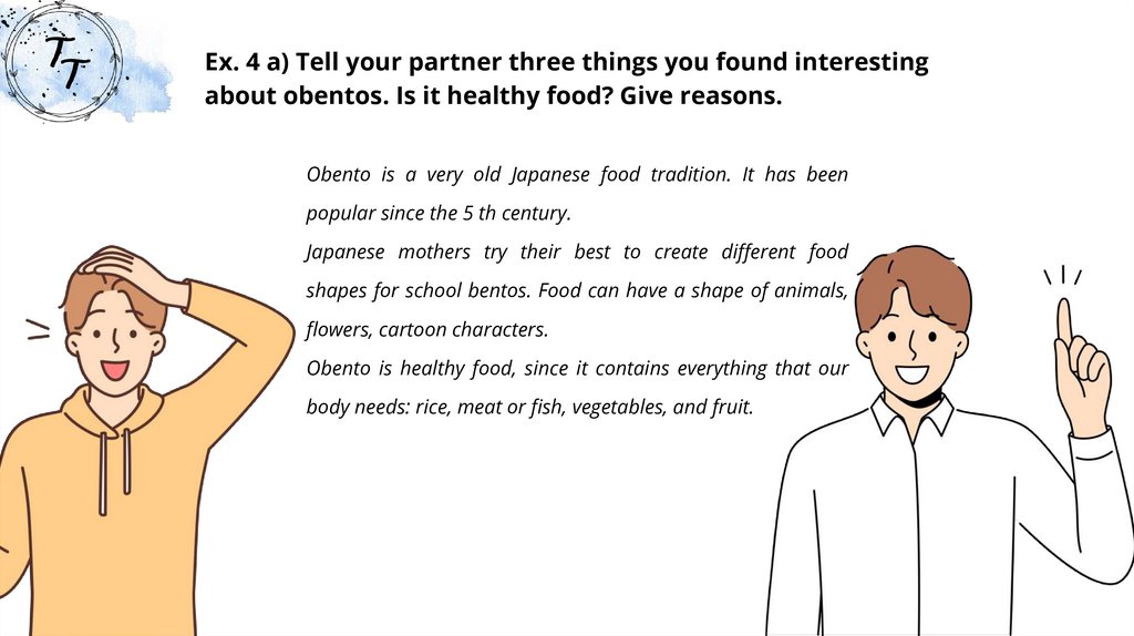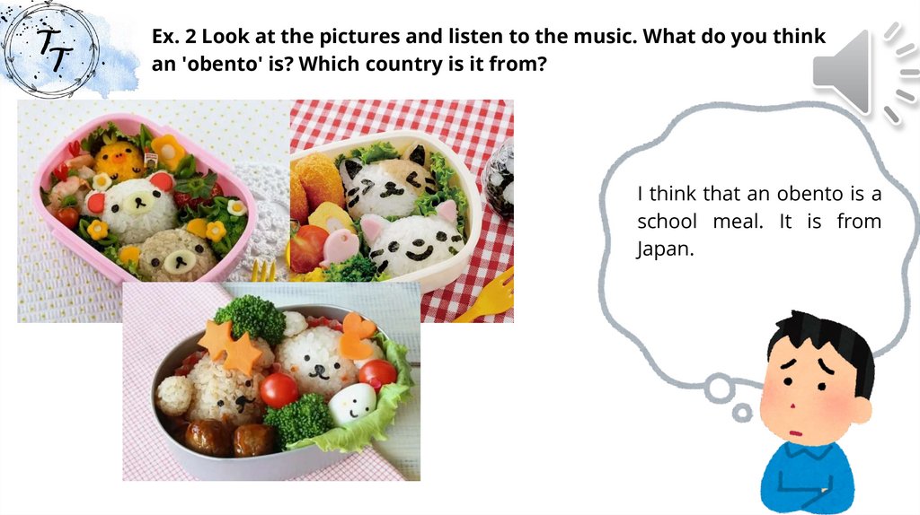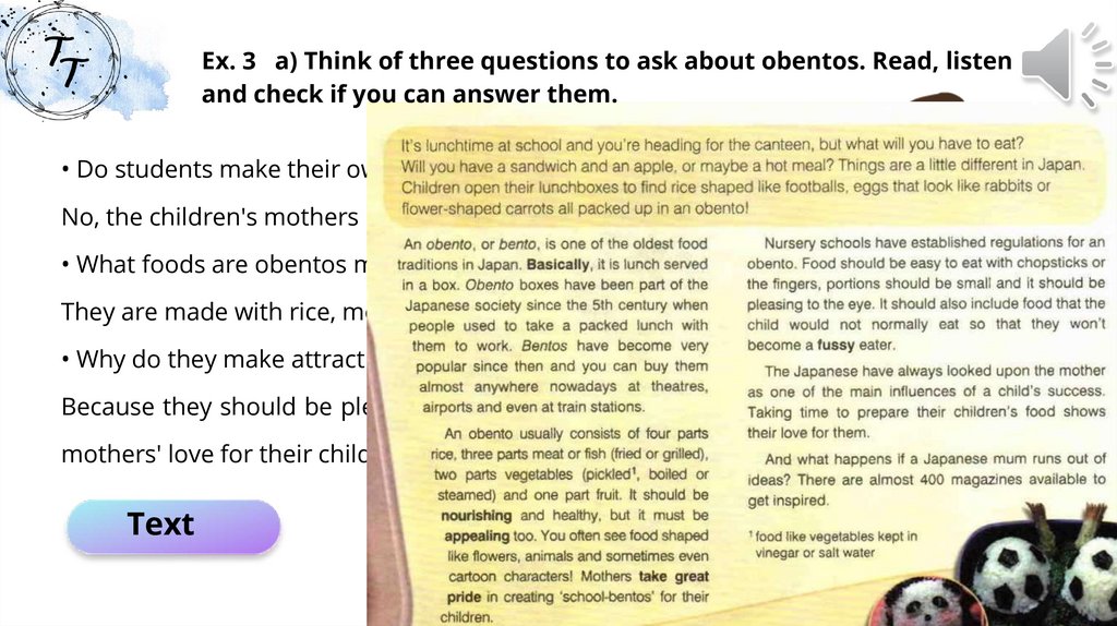 TTEx. 3 а) Think of three questions to ask about obentos. Read, listen