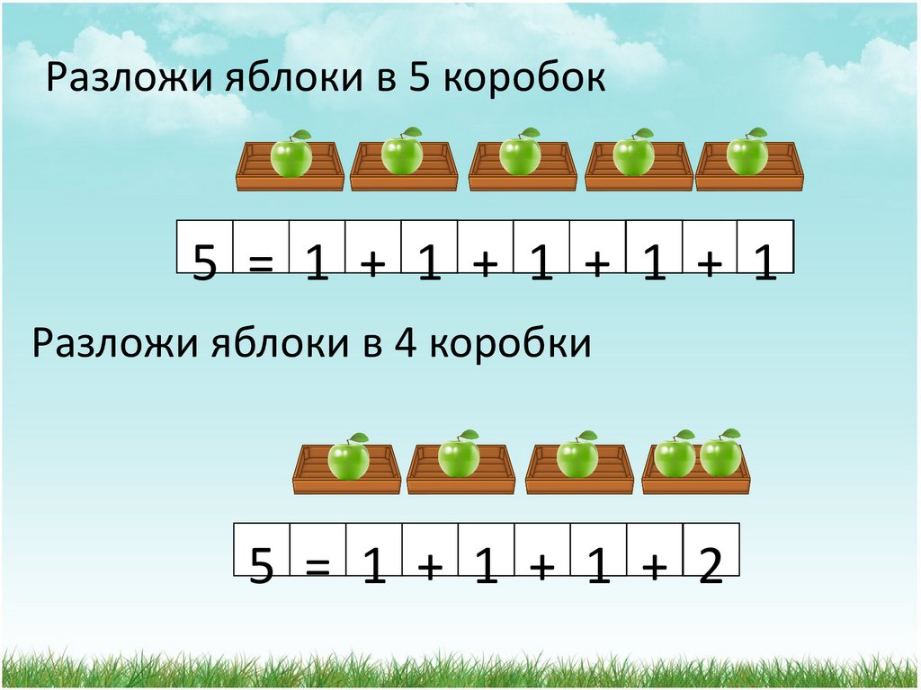 Разложи яблоки в 5 коробок5 = 1 + 1 + 1 + 1 + 1