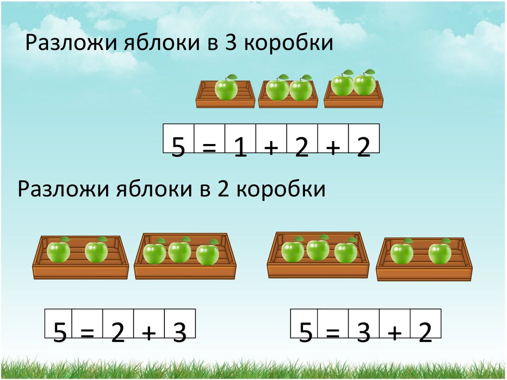 Разложи яблоки в 3 коробки5 = 1 + 2 + 2