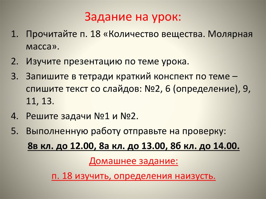 1. Прочитайте п. 18 «Количество вещества. Молярнаямасса».