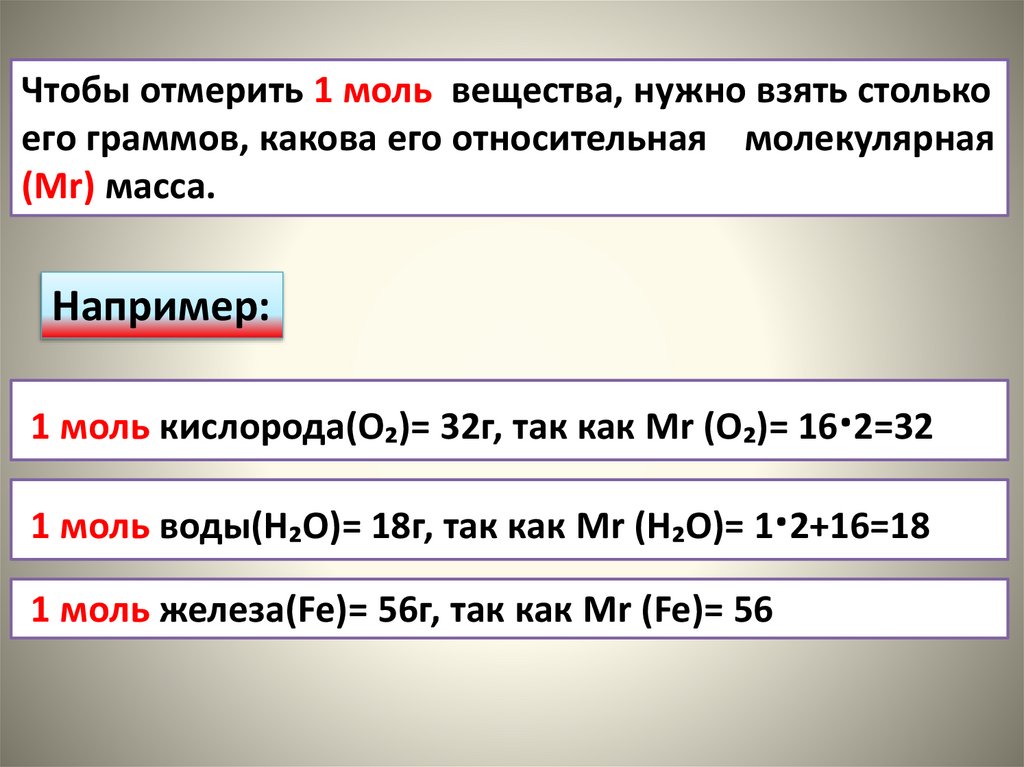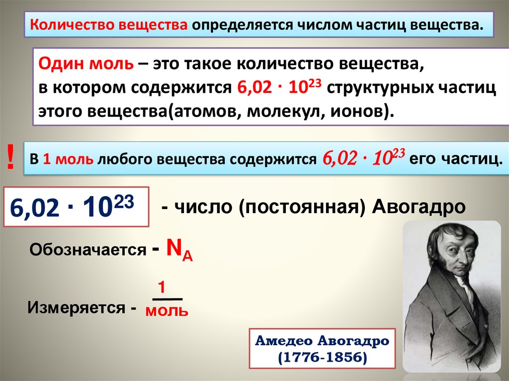 6. Вещество измеряют порциями. Порция – это количество вещества, измеряется в молях. Обозначение n или ν [моль]
