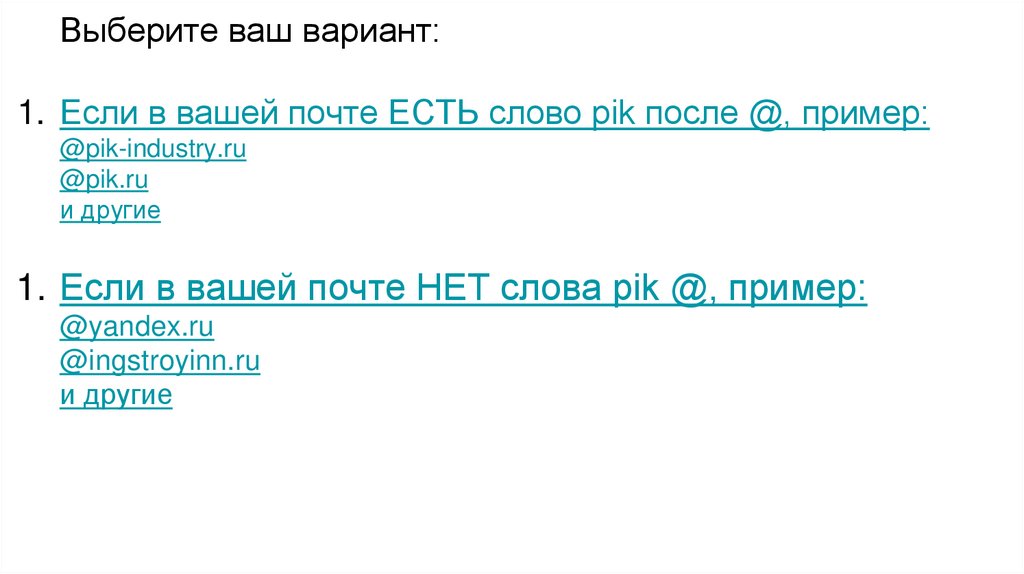 Выберите ваш вариант:1. Если в вашей почте ЕСТЬ слово pik после @, пример: