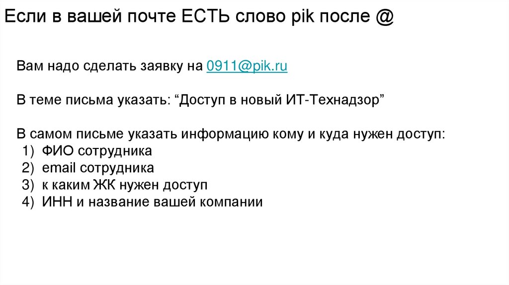 Если в вашей почте ЕСТЬ слово pik после @Вам надо сделать заявку на 0911@pik.ru