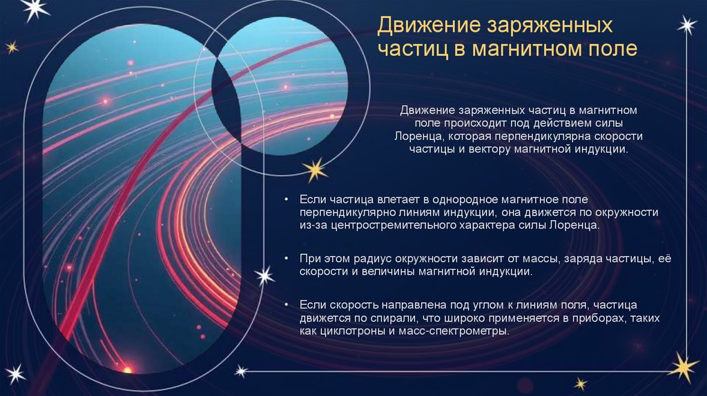• При этом радиус окружности зависит от массы, заряда частицы, её