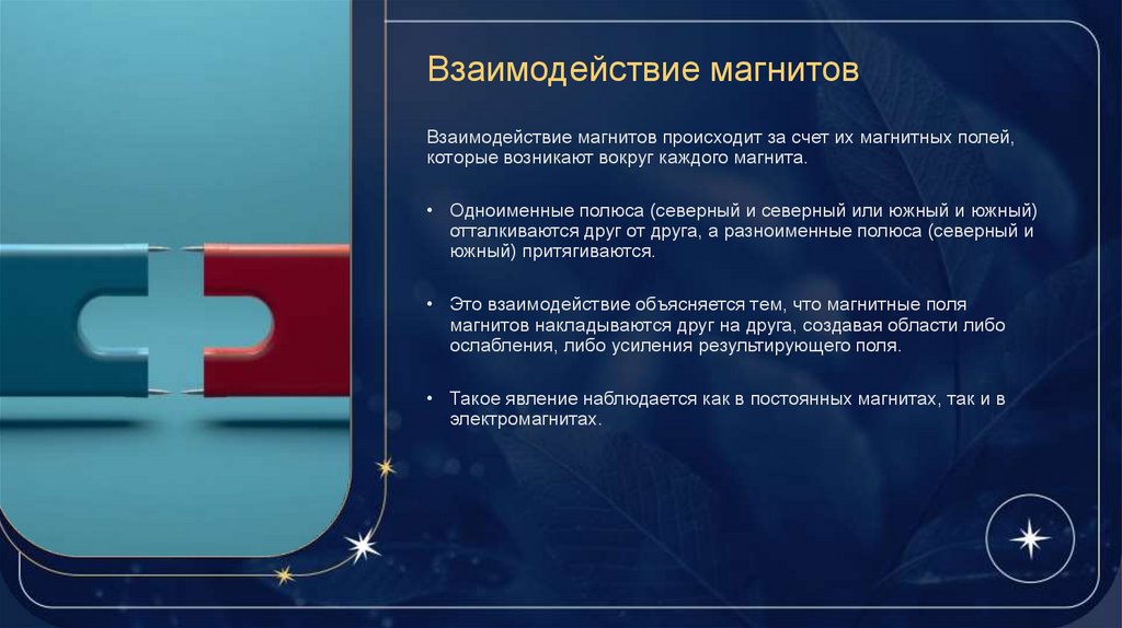Взаимодействие магнитовВзаимодействие магнитов происходит за счет их магнитных полей,