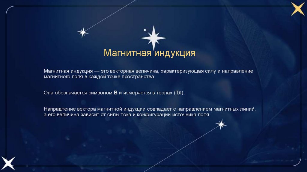 Магнитная индукцияМагнитная индукция — это векторная величина, характеризующая силу и направление