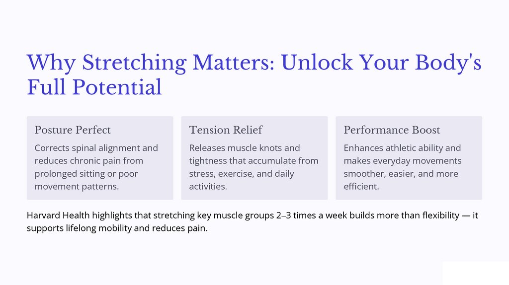 Harvard Health highlights that stretching key muscle groups 2–3 times a week builds more than flexibility — it