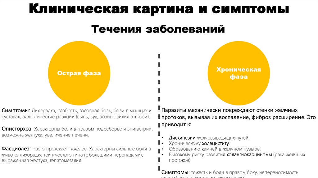 Фасциолез: Часто протекает тяжелее. Характерны сильные боли в