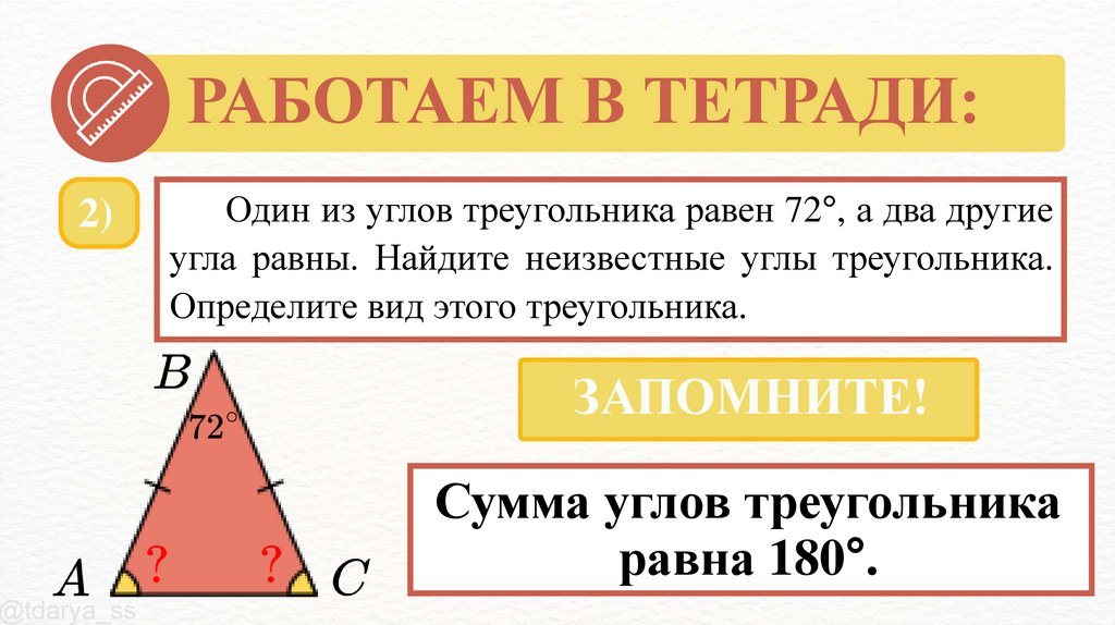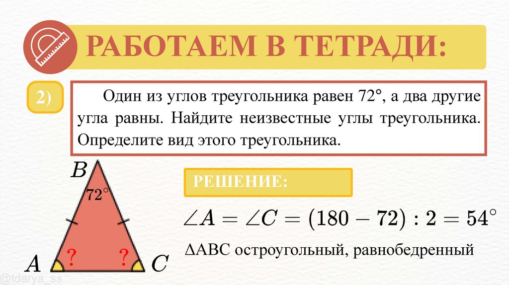Один из углов треугольника равен 72°, а два другие