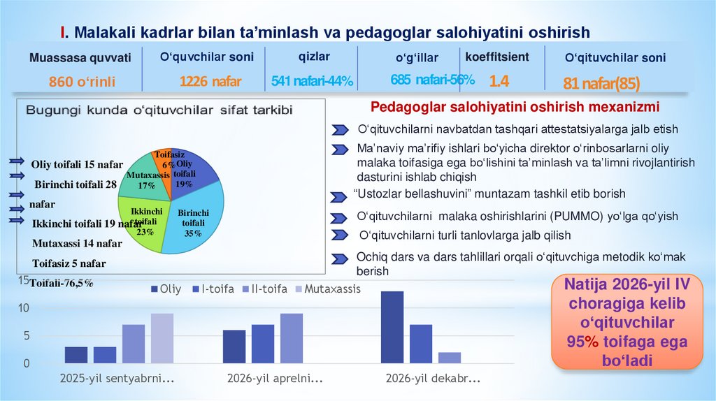 I. Malakali kadrlar bilan ta’minlash va pedagoglar salohiyatini oshirishMuassasa quvvati