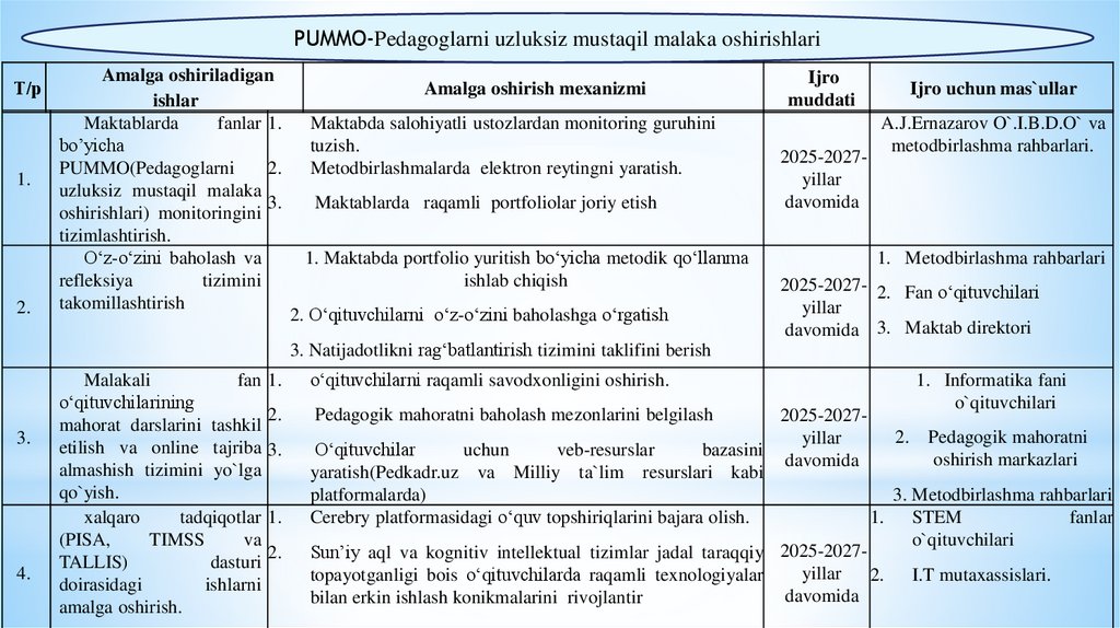 O‘qituvchilarni malaka oshirishlarini (PUMMO) yo‘lga qo‘yish