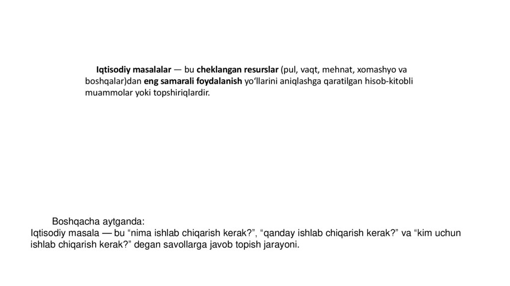 Iqtisodiy masala — bu “nima ishlab chiqarish kerak?”, “qanday ishlab chiqarish kerak?” va “kim uchun