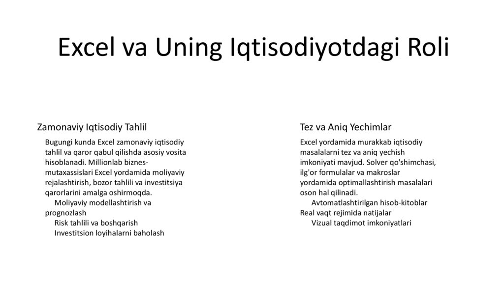 Excel va Uning Iqtisodiyotdagi RoliZamonaviy Iqtisodiy Tahlil