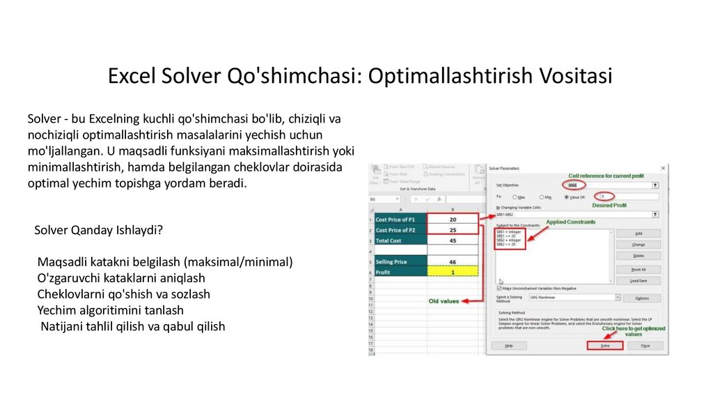 Excel Solver Qo'shimchasi: Optimallashtirish VositasiSolver - bu Excelning kuchli qo'shimchasi bo'lib, chiziqli va