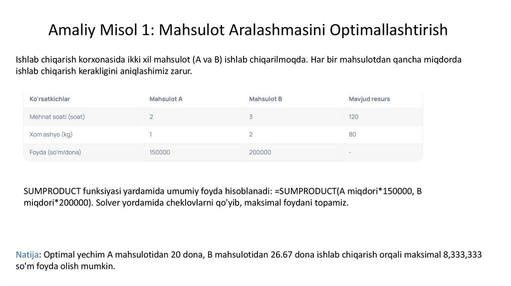 Amaliy Misol 1: Mahsulot Aralashmasini OptimallashtirishIshlab chiqarish korxonasida ikki xil mahsulot (A va B) ishlab chiqarilmoqda. Har bir mahsulotdan qancha miqdorda