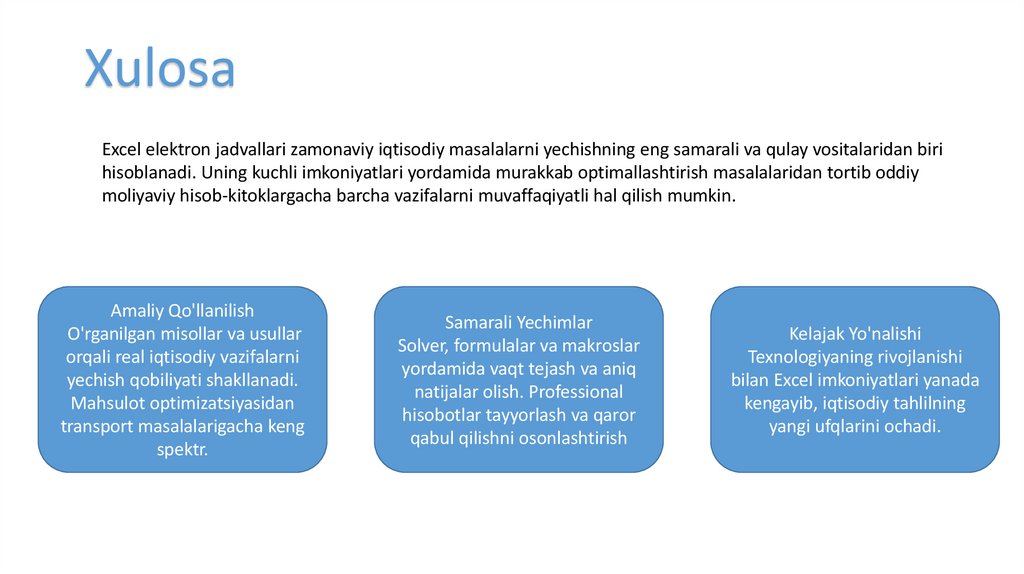 XulosaExcel elektron jadvallari zamonaviy iqtisodiy masalalarni yechishning eng samarali va qulay vositalaridan biri