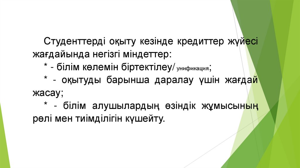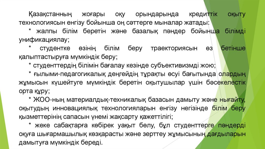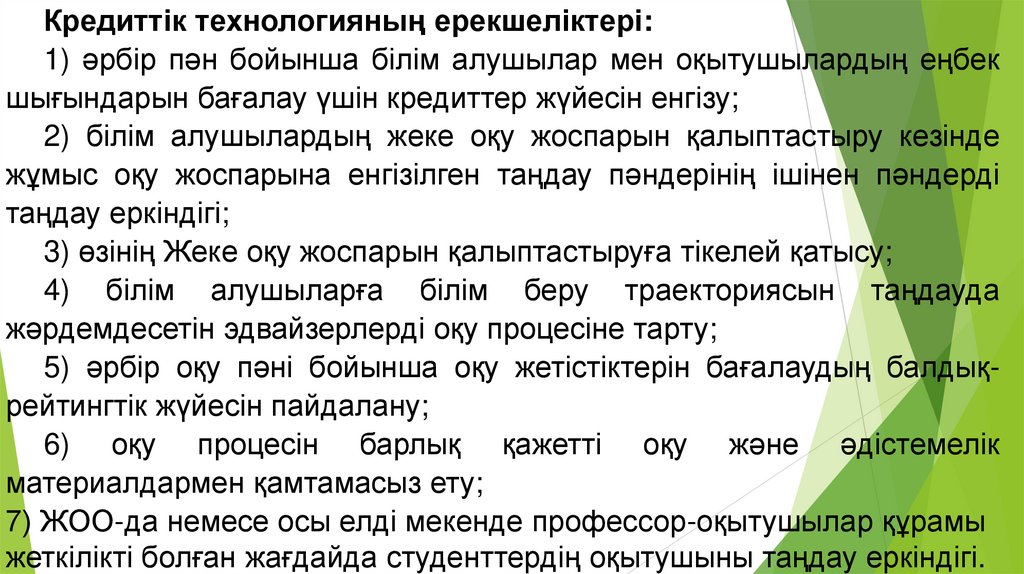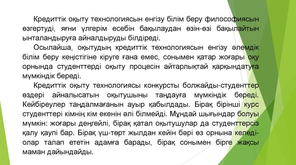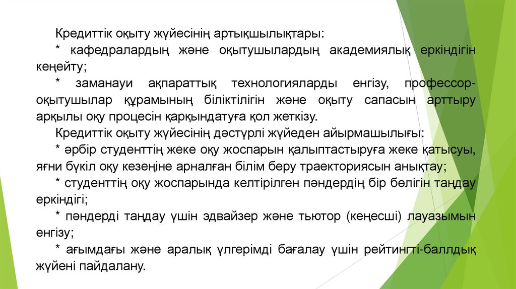 Кредиттік оқыту жүйесінің артықшылықтары:* кафедралардың және оқытушылардың академиялық еркіндігін
