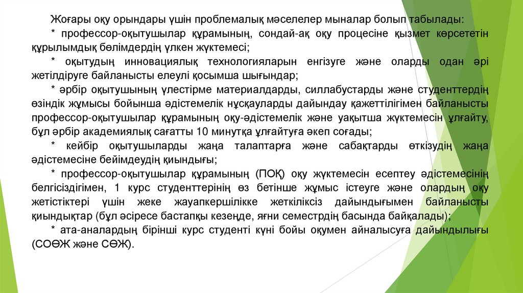 Жоғары оқу орындары үшін проблемалық мәселелер мыналар болып табылады:* профессор-оқытушылар құрамының, сондай-ақ оқу процесіне қызмет көрсететін