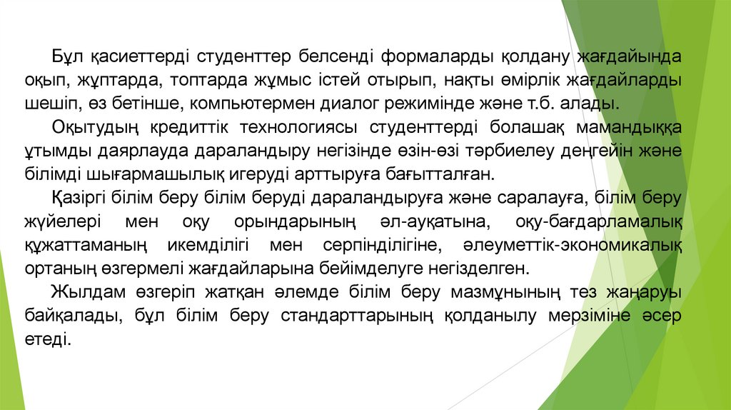 Бұл қасиеттерді студенттер белсенді формаларды қолдану жағдайындаоқып, жұптарда, топтарда жұмыс істей отырып, нақты өмірлік жағдайларды