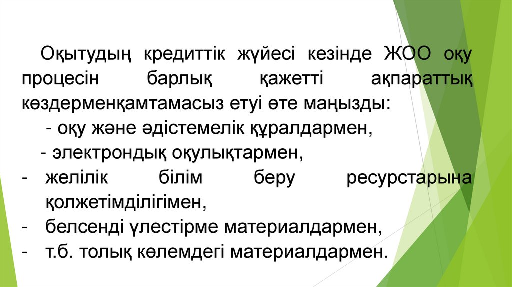 Кредиттік оқыту технологиясын енгізу білім беру философиясынөзгертуді, яғни үлгерім есебін бақылаудан өзін-өзі бақылайтын