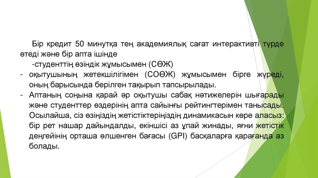 Бір кредит 50 минутқа тең академиялық сағат интерактивті түрдеөтеді және бір апта ішінде
