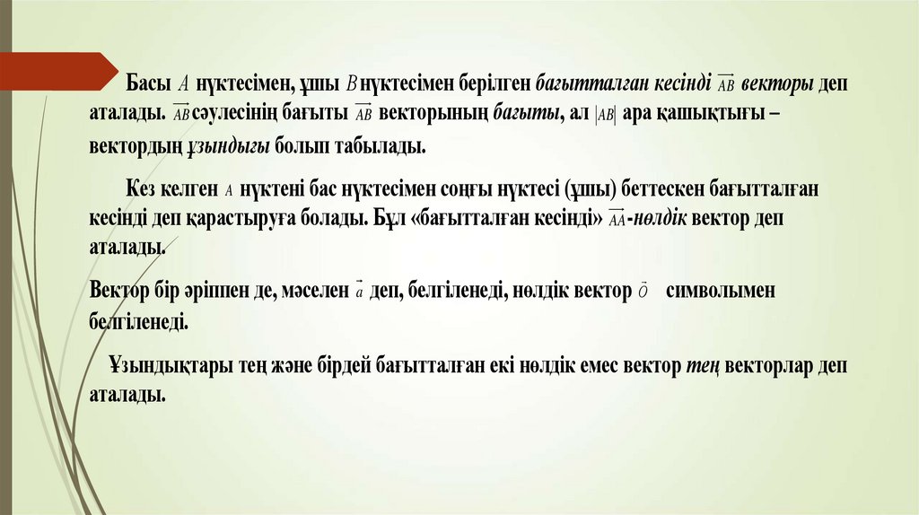 Басы А нүктесімен, ұшы В нүктесімен берілген бағытталған кесінді AB векторы депаталады. AB сәулесінің бағыты AB векторының бағыты, ал AB ара қашықтығы –