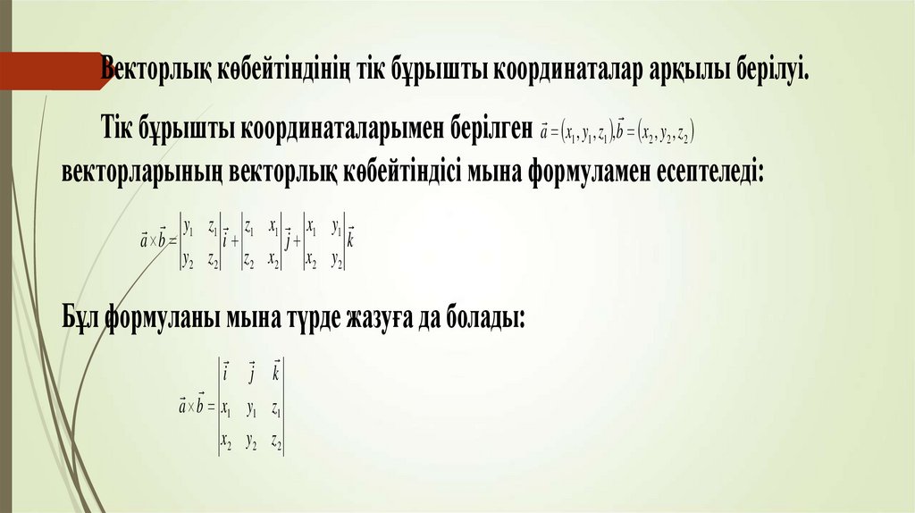 Векторлық көбейтiндiнiң тiк бұрышты координаталар арқылы берілуі.a x1 , y1 , z1 , b x2 , y2 , z 2
