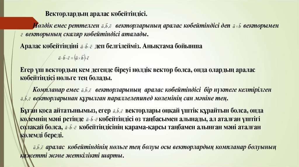 Векторлардың аралас көбейтiндiсi.Нөлдiк емес реттелген a , b , c векторларының аралас көбейтiндiсi деп a b векторымен