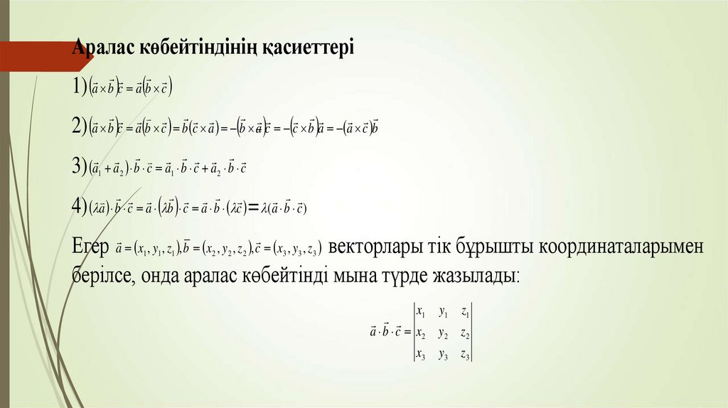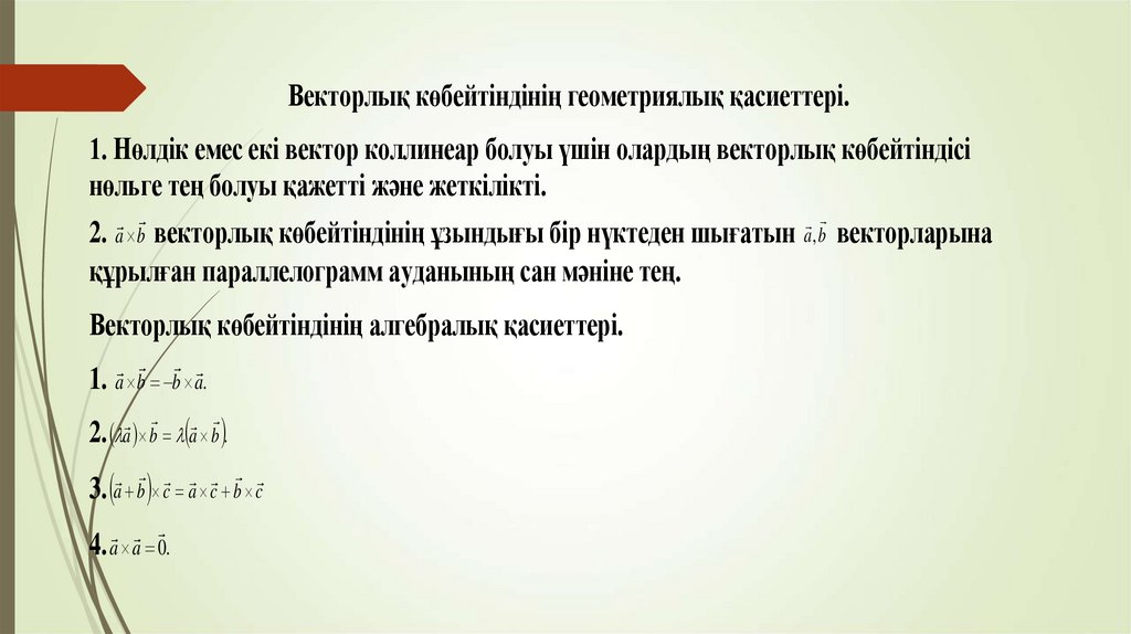 Векторлық көбейтiндiнiң геометриялық қасиеттерi.1. Нөлдiк емес екi вектор коллинеар болуы үшiн олардың векторлық көбейтiндiсi