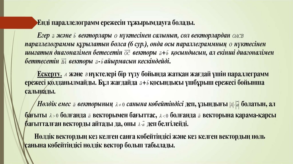Енді параллелограмм ережесін тұжырымдауға болады.Егер а және b векторлары O нүктесінен салынып, сол векторлардан ОАСВ