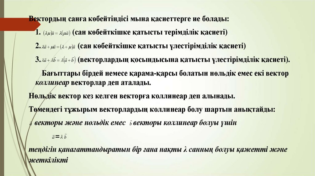 Вектордың санға көбейтіндісі мына қасиеттерге ие болады:1. a a (сан көбейткішке қатысты терімділік қасиеті)