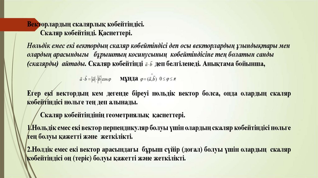 Векторлардың скалярлық көбейтіндісі.Скаляр көбейтiндi. Қасиеттерi.