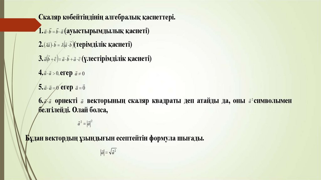 Скаляр көбейтiндiнiң алгебралық қасиеттерi.1. a b b a (ауыстырымдылық қасиетi)