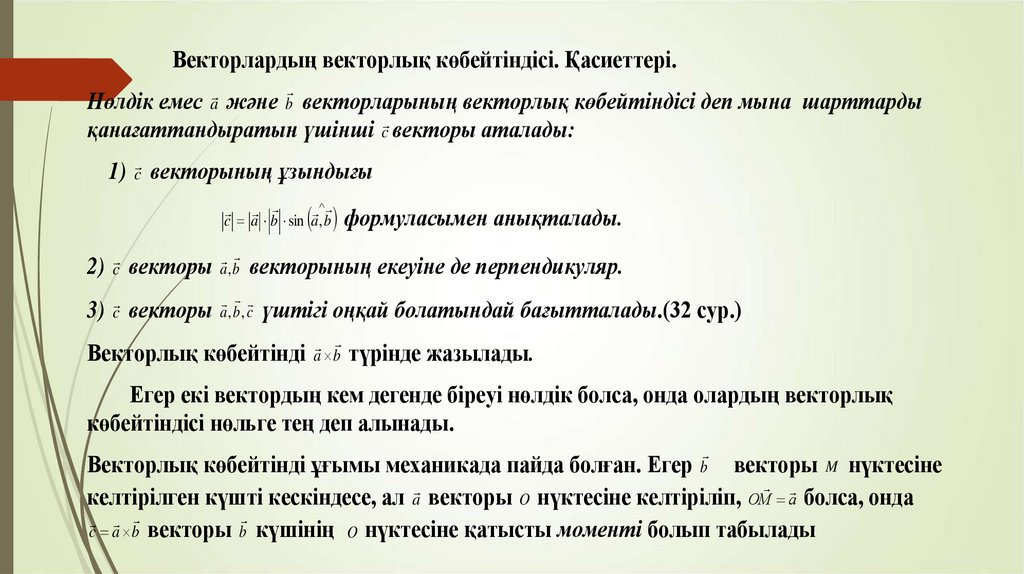 Векторлардың векторлық көбейтiндiсі. Қасиеттері.Нөлдiк емес a және b векторларының векторлық көбейтiндiсi деп мына шарттарды
