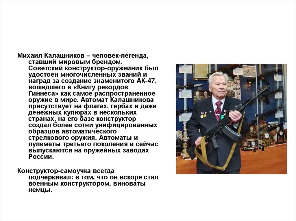 Михаил Калашников – человек-легенда,ставший мировым брендом.