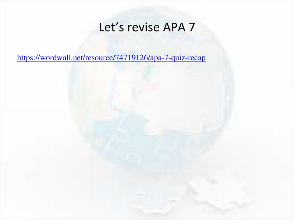 Let’s revise APA 7https://wordwall.net/resource/74719126/apa-7-quiz-recap
