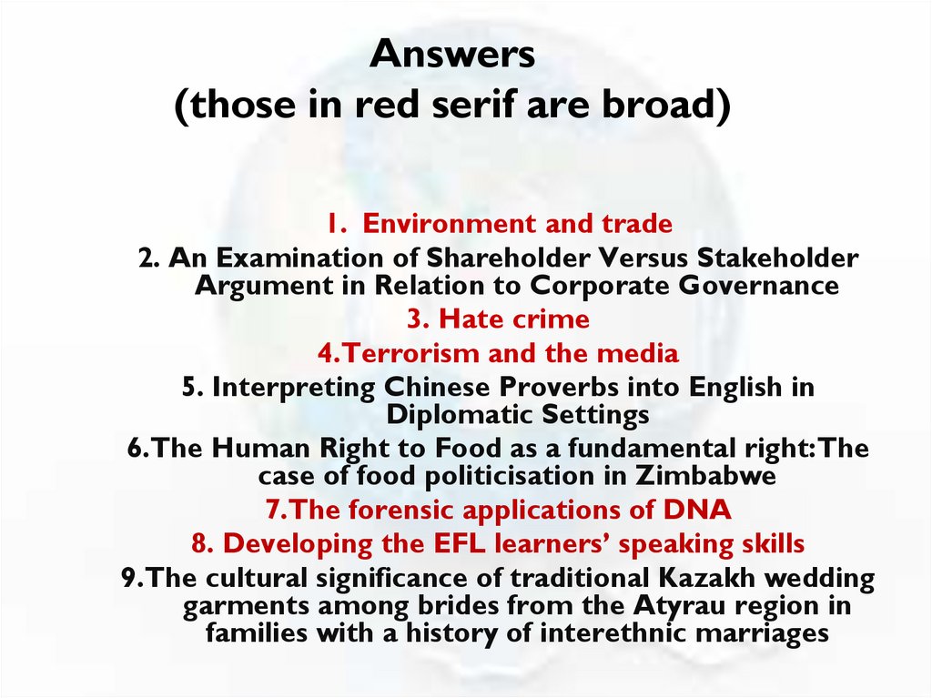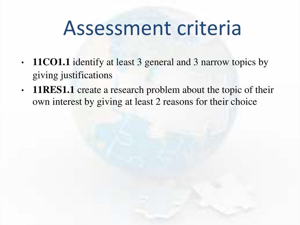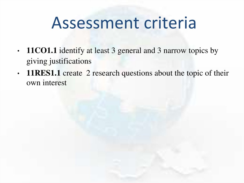 Assessment criteria11CO1.1 identify at least 3 general and 3 narrow topics by