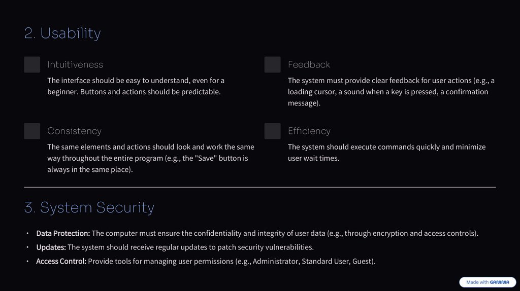 • Data Protection: The computer must ensure the confidentiality and integrity of user data (e.g., through encryption and access controls).