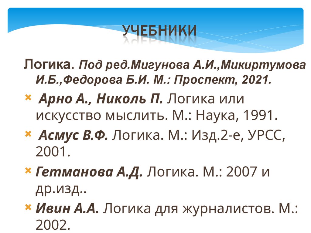 Логика. Под ред.Мигунова А.И.,МикиртумоваИ.Б.,Федорова Б.И. М.: Проспект, 2021.