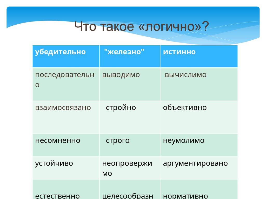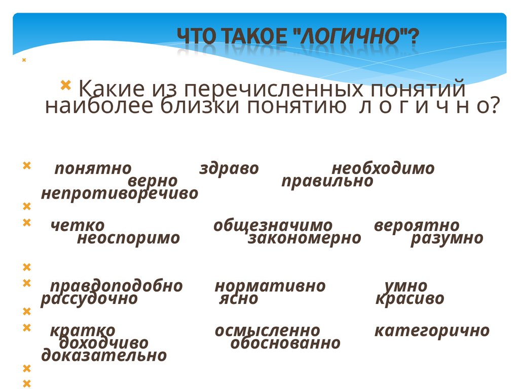 Какие из перечисленных понятийнаиболее близки понятию л о г и ч н о?